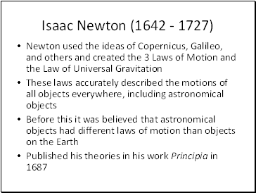 Newton used the ideas of Copernicus, Galileo, and others and created the 3 Laws of Motion and the Law of Universal Gravitation