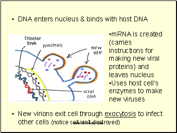 New virions exit cell through exocytosis to infect other cells (notice cell isn’t destroyed)