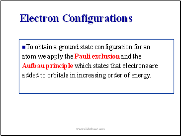 To obtain a ground state configuration for an atom we apply the Pauli exclusion and the Aufbau principle which states that electrons are added to orbitals in increasing order of energy.