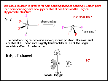 Because repulsion is greater for non-bonding than for bonding electron pairs, then non-bonding pairs occupy equatorial positions on the Trigonal Bipyramidal structure