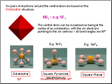 The central atom can be visualized as being at the centre of an octahedron, with the six electrons pointing to the six vertices – all bond angles are 90°