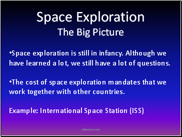 •Space Exploration The Big Picture Space exploration is still in infancy. Although we have learned a lot, we still have a lot of questions.