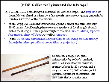 More: A typical Galilean refractor had a plano-convex objective lens with 30-40 inches focal length; plano-concave eyepiece of focal length about 2 inches focal length. It was good enough to discover Lunar features, Jupiter’s four moons, phase of Venus, as well as sunspots.