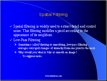 Spatial filtering is widely used to extract detail and control noise. This filtering modifies a pixel according to the appearance of its neighbors.
