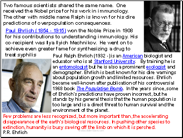 Two famous scientists shared the same name. One received the Nobel prize for his work in immunology. The other with middle name Ralph is known for his dire predictions of overpopulation consequences.
