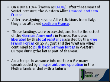 On 6 June 1944 (known as D-Day), after three years of Soviet pressure, the Western Allies invaded northern France.