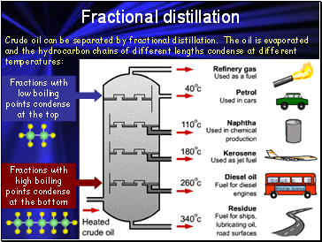 Crude oil can be separated by fractional distillation. The oil is evaporated and the hydrocarbon chains of different lengths condense at different temperatures: