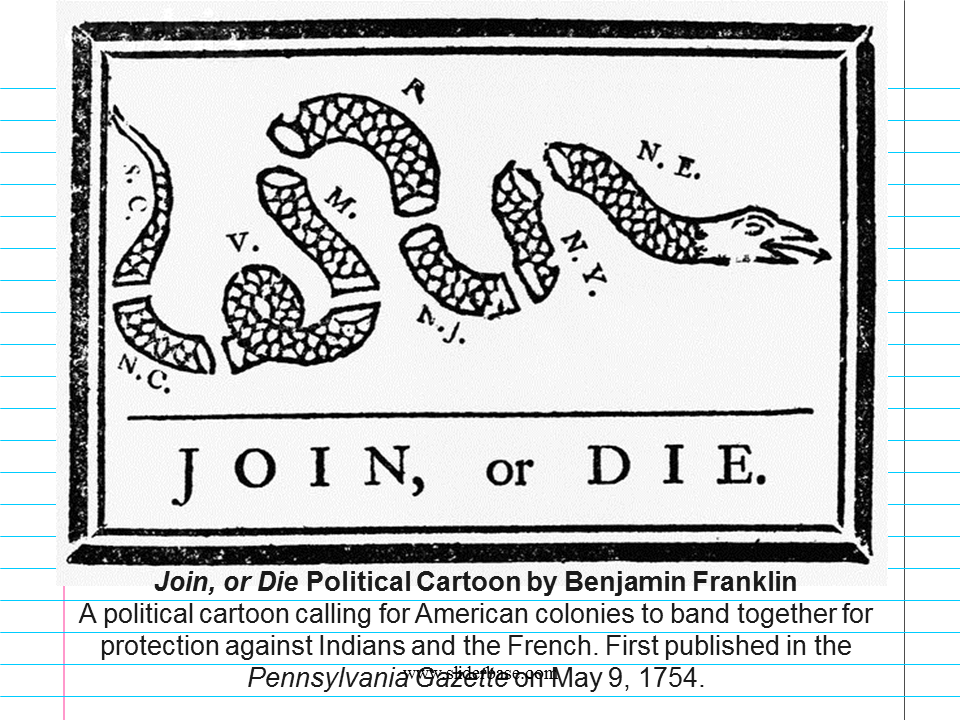 Join, or Die Political Cartoon by Benjamin Franklin A political cartoon calling for American colonies to band together for protection against Indians and the French. First published in the Pennsylvania Gazette on May 9, 1754.