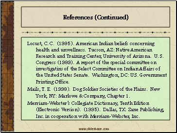 Locust, C. C. (1985). American Indian beliefs concerning health and unwellness. Tucson, AZ: Native American Research and Training Center, University of Arizona. U. S. Congress (1989). A report of the special committee on investigatins of the Select Committee on Indian Affairs of the United States Senate. Washington, DC: U.S. Government Printing Office.