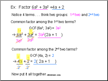 Ex: Factor 6a3 + 3a2 +4a + 2
