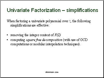 When factoring a univariate polynomial over Z, the following simplifications are effective: