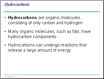 Hydrocarbons are organic molecules consisting of only carbon and hydrogen