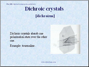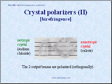 The input is natural light, the output is polarized light (linear, circular, elliptical). They work by dichroism, birefringence, reflection, or scattering.