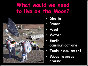 All humans need water to drink. Water also can be broken into hydrogen and oxygen and used as a fuel or to create an atmosphere at the enclosed base.