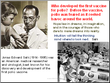 Jonas Edward Salk (1914 -1995) was an American medical researcher and virologist, best known for his discovery and development of the first polio vaccine.
