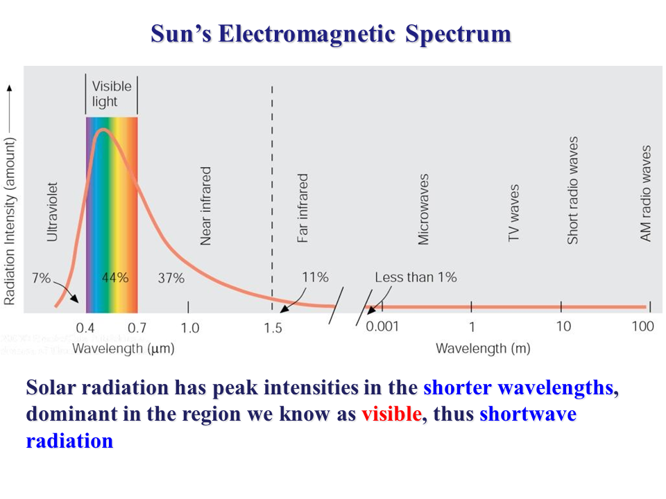 Solar radiation has peak intensities in the shorter wavelengths, dominant in the region we know as visible, thus shortwave radiation