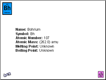 Name: Bohrium Symbol: Bh Atomic Number: 107 Atomic Mass: (262.0) amu Melting Point: Unknown Boiling Point: Unknown