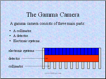 A typical gamma camera is 40 cm in diameter – large enough to examine body tissues or specific organs. The gamma rays are given off in all directions but only the ones which travel towards the gamma camera will be detected.