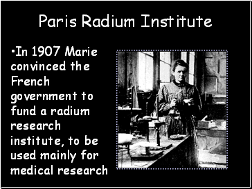 In 1907 Marie convinced the French government to fund a radium research institute, to be used mainly for medical research