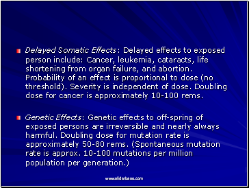 Delayed Somatic Effects: Delayed effects to exposed person include: Cancer, leukemia, cataracts, life shortening from organ failure, and abortion. Probability of an effect is proportional to dose (no threshold). Severity is independent of dose. Doubling dose for cancer is approximately 10-100 rems.