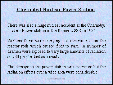 There was also a huge nuclear accident at the Chernobyl Nuclear Power station in the former USSR in 1986.
