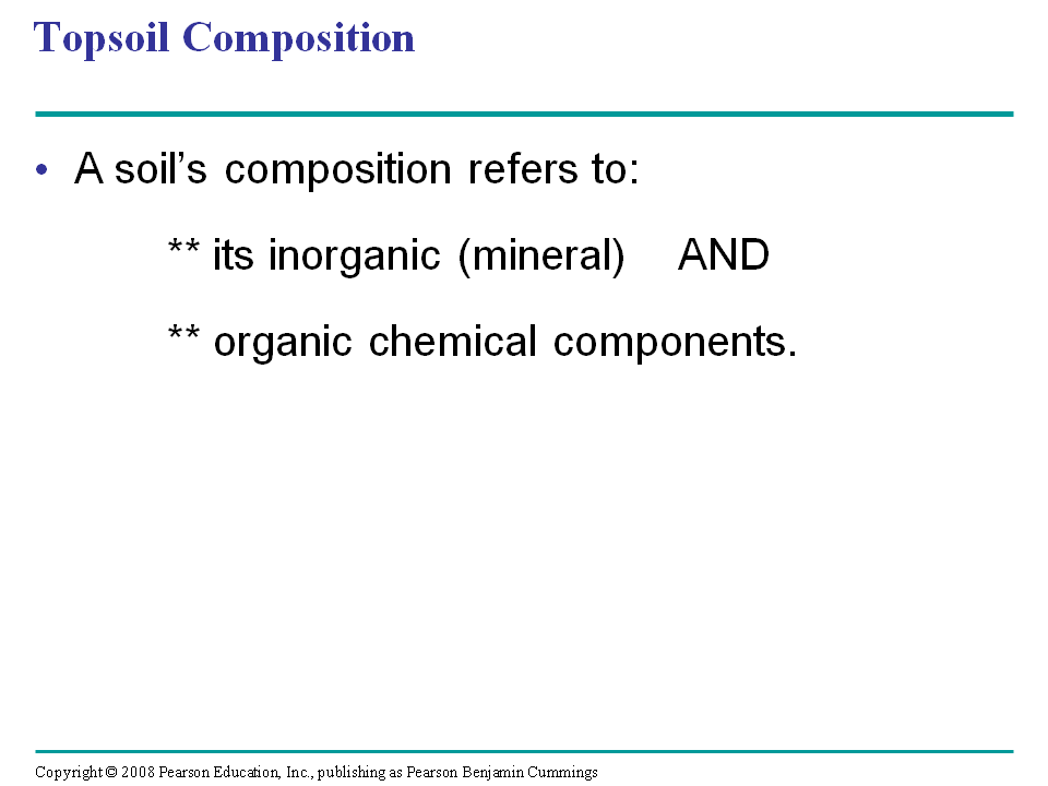 Topsoil consists of mineral particles, living organisms, and humus = the decaying organic material.