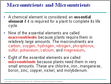 Nine of the essential elements are called macronutrients because plants require them in relatively large amounts. The macronutrients are carbon, oxygen, hydrogen, nitrogen, phosphorus, sulfur, potassium, calcium, and magnesium.