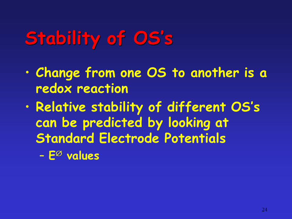Relative stability of different OS’s can be predicted by looking at Standard Electrode Potentials