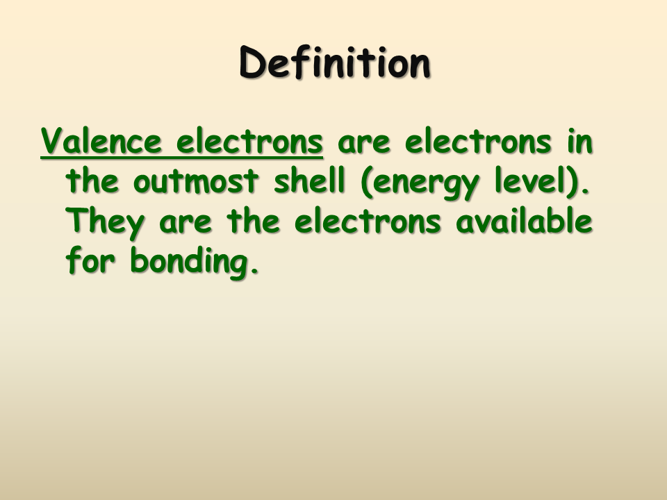 Valence electrons are electrons in the outmost shell (energy level). They are the electrons available for bonding.
