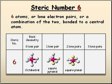 6 atoms, or lone electron pairs, or a combination of the two, bonded to a central atom.