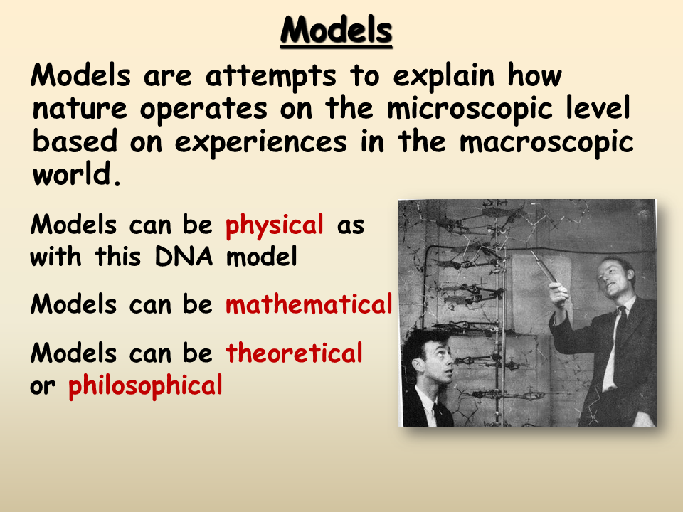 Models are attempts to explain how nature operates on the microscopic level based on experiences in the macroscopic world.