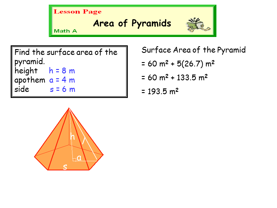 Find the surface area of the pyramid. height h = 8 m apothem a = 4 m side s = 6 m