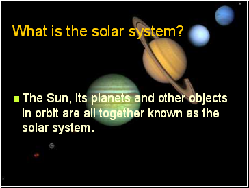 The Sun, its planets and other objects in orbit are all together known as the solar system.