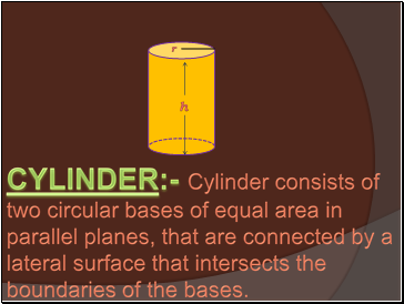 CYLINDER:- Cylinder consists of two circular bases of equal area in parallel planes, that are connected by a lateral surface that intersects the boundaries of the bases.