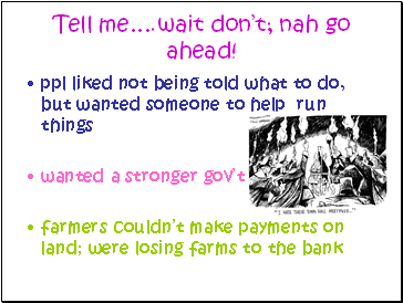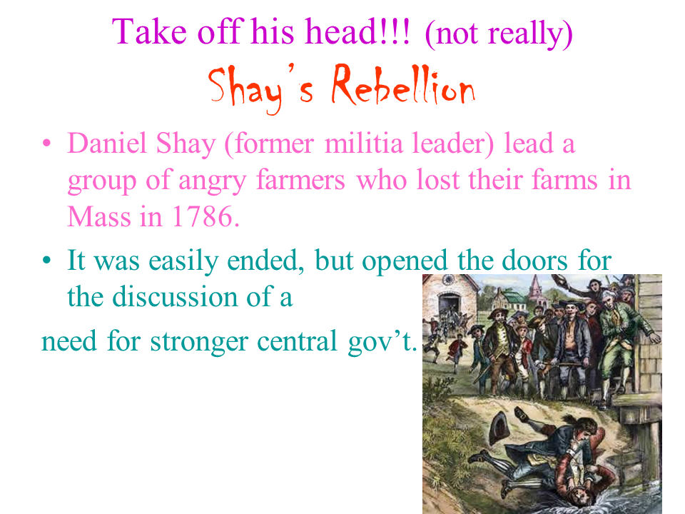 Daniel Shay (former militia leader) lead a group of angry farmers who lost their farms in Mass in 1786.