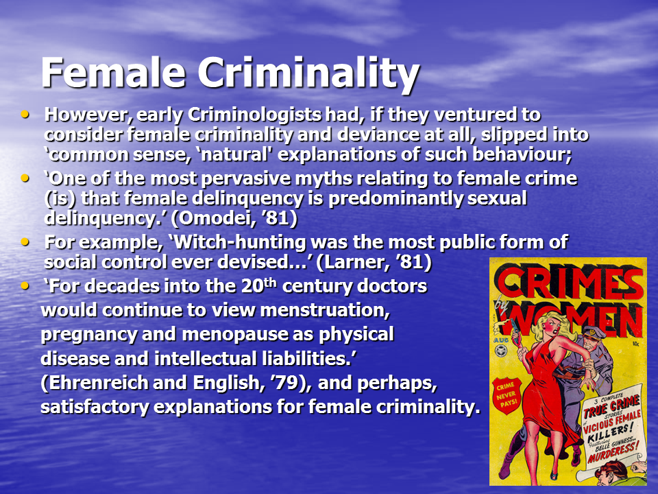 However, early Criminologists had, if they ventured to consider female criminality and deviance at all, slipped into ‘common sense, ‘natural' explanations of such behaviour;