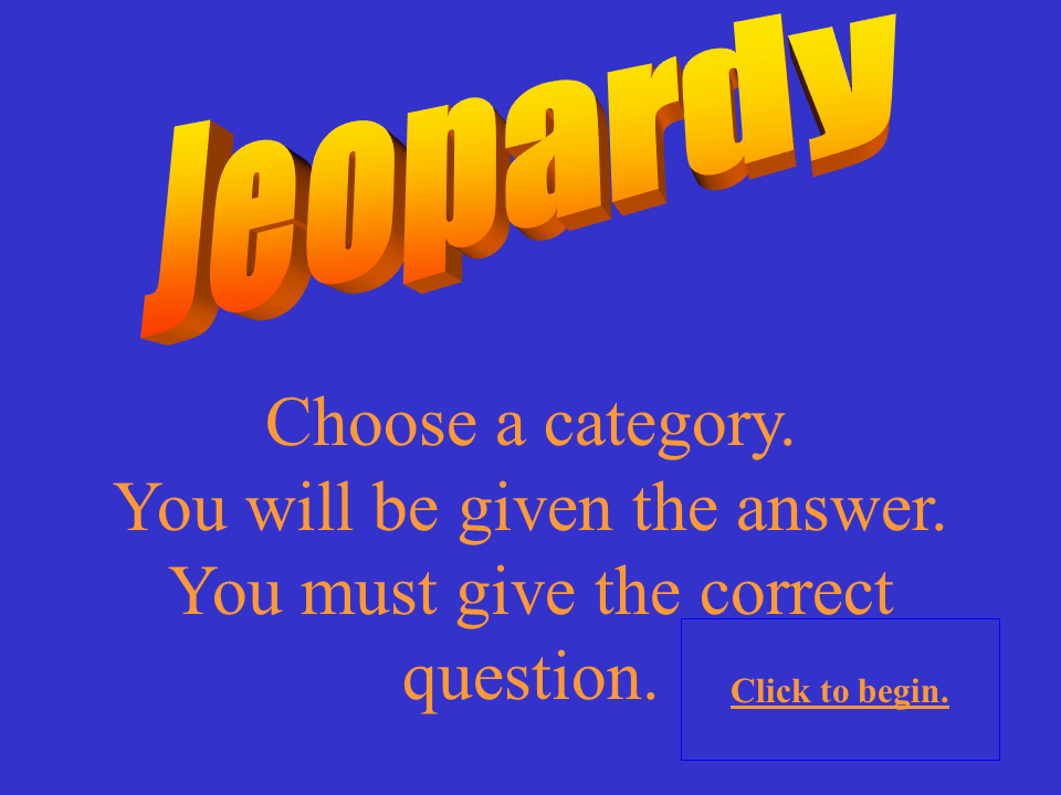 Remember this is Jeopardy, so where I have written “Answer” this is the prompt the students will see, and where I have “Question” should be the student’s response.