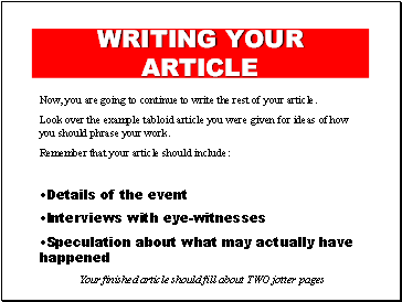 Look over the example tabloid article you were given for ideas of how you should phrase your work.