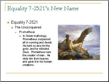 In the society in Anthem, naming is a form of identifying one’s possessions as one’s own. For this reason, Equality 7-2521 names the Golden One on two separate occasions, names himself, and searches relentlessly for the word “I.”
