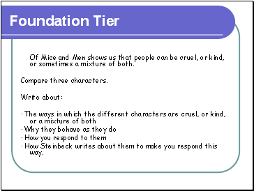 Below are some possible essay topics suitable for GCSE Level questions on 'Of Mice and Men'. Use these topics for revision by writing or planning the essays and comparing your work with that of a friend.