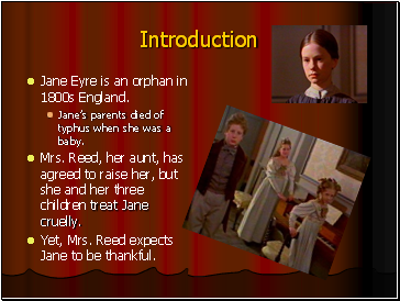 Mrs. Reed, her aunt, has agreed to raise her, but she and her three children treat Jane cruelly.