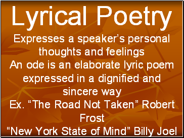 Expresses a speaker’s personal thoughts and feelings An ode is an elaborate lyric poem expressed in a dignified and sincere way Ex. “The Road Not Taken” Robert Frost “New York State of Mind” Billy Joel