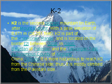 K2 is the second-highest mountain on Earth, afterMount Everest. With a peak elevation of 8,611 m (28,251 feet), K2 is part of the Karakoram Range, and is located on the border[2] between Gilgit, in Gilgit-Baltistan of Pakistan and the Taxkorgan Tajik Autonomous County of Xinjiang, China.[3][note] It is more hazardous to reach K2 from the Chinese side; thus, it is mostly climbed from the Pakistani side.