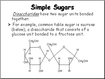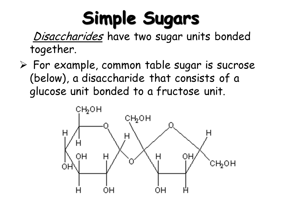 For example, common table sugar is sucrose (below), a disaccharide that consists of a glucose unit bonded to a fructose unit.