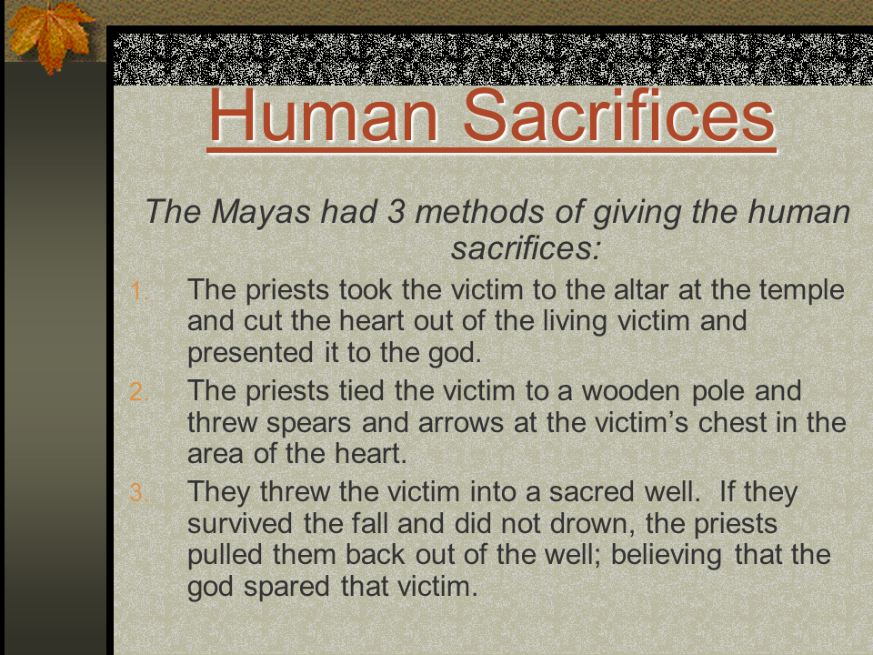 The priests tied the victim to a wooden pole and threw spears and arrows at the victim’s chest in the area of the heart.