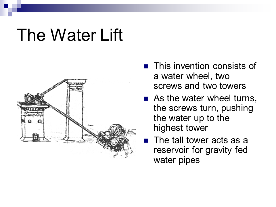 As the water wheel turns, the screws turn, pushing the water up to the highest tower