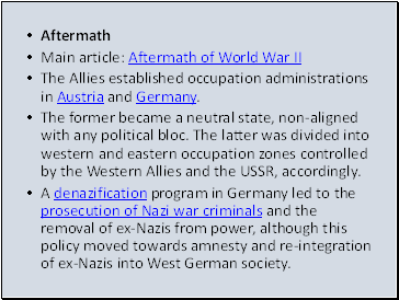 The former became a neutral state, non-aligned with any political bloc. The latter was divided into western and eastern occupation zones controlled by the Western Allies and the USSR, accordingly.