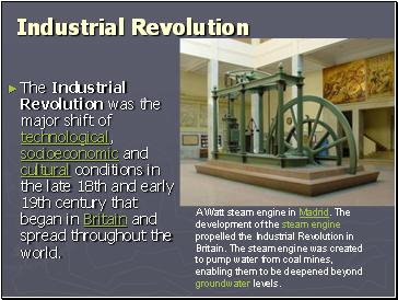 A Watt steam engine in Madrid. The development of the steam engine propelled the Industrial Revolution in Britain. The steam engine was created to pump water from coal mines, enabling them to be deepened beyond groundwater levels.