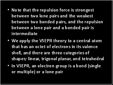 Note that the repulsion force is strongest between two lone pairs and the weakest between two bonded pairs, and the repulsion between a lone pair and a bonded pair is intermediate