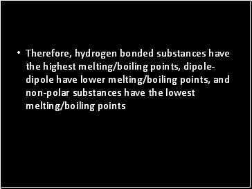 Therefore, hydrogen bonded substances have the highest melting/boiling points, dipole-dipole have lower melting/boiling points, and non-polar substances have the lowest melting/boiling points